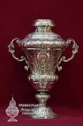 Alpaca bañada en plata, cincelada y repujada a mano, con asas de dragón alado y cabeza de querubín en el centro con gran volumen, también está lacada para su conservación. TamañoAlto: 40 cm. ...