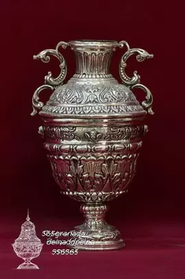 Ánfora barroca cincelada y repujada a mano en alpaca plateada y lacada para su conservación.