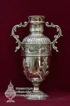 Alpaca bañada en plata, cincelada y repujada a mano, con asas de dragón alado y cabeza de querubín en el centro con gran volumen, también está lacada para su conservación. TamañoAlto: 40 cm. ...