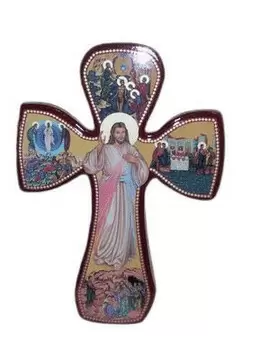 Cruz de madera, con la imagen de Jesús de la misericordia y los misterios del rosario.