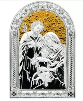 Cuadro icono Sagrada Familia en madera con placa de plata bilaminada.