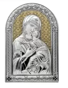 Cuadro icono Virgen de la ternura en madera con placa de plata bilaminada de plata.