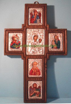 Icono bizantino en forma de cruz con diferentes imágenes sagradas. Plata pura.