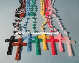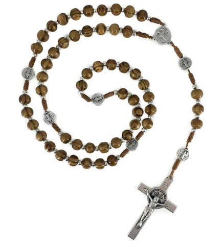 Rosario en cuentas redondas de olivo, bolas atadas en cuerda, medalla central de San Benito en alpaca, cuentas de Padre Nuestros representando el Santo en alpaca.
