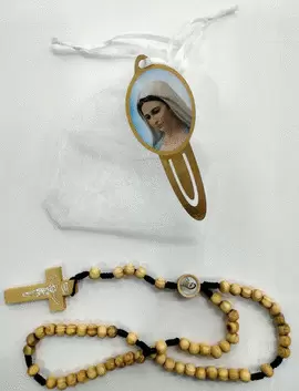 Bolsita de tela con marcapáginas y rosario de la Virgen de Medjugorje en madera.