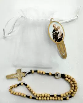 Bolsita de tela con marcapáginas y rosario de San Antonio en madera.