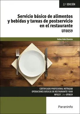 Para realizar tareas sencillas de servicio de alimentos, bebidas y complementos utilizaremos técnicas simples en función de la fórmula de restauración y tipos de servicio y clientes de que se trate. En este libro veremos cómo identificar las diferentes técnicas de servicio y de qué manera aplicar las más sencillas y de uso común, seleccionando y aprendiendo a usar los útiles e instrumentos necesarios para ello. Además, aprenderemos a colaborar en el proceso de cierre de las áreas de consumo de alimentos y bebidas, aplicando instrucciones definidas y atendiendo a las normas de seguridad correspondientes. Cada capítulo se complementa con actividades de repaso, cuyas soluciones están disponibles en www.paraninfo.es. Los contenidos se corresponden con los de la UF0059 Servicio básico de alimentos y bebidas y tareas de postservicio en el restaurante, incardinada en el MF0257_1 Servicio básico de restaurante-bar, perteneciente al certificado profesional HOTR0208 Operaciones básicas de restaurante y bar, regulado por el RD 1376/2008, de 1 de agosto, y modificado por el RD 619/2013, de 2 de agosto. Esther Urda Chami
