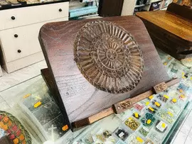 Atril de mesa elaborado en madera castaño con detalle "rosetón".