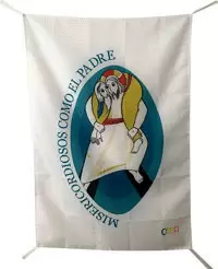 La balconera del Año de la Misericordia fabricada en textil de alta calidad con cordeles en las esquinas para colocarla fácilmente en el balcón de tu casa, en la parroquia, en el colegio...
