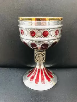 Cáliz acabado en plateado con piedras superpuestas.Dimensiones: 12 x 11 cm. ...