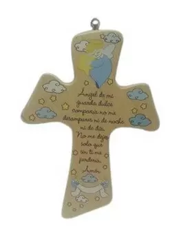 Cruz de madera de 21x15 cm. Ángel de la guarda azul.