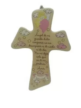 Cruz de madera 21x15. Ángel de la guarda rosa.