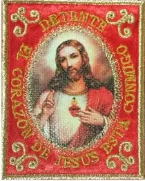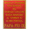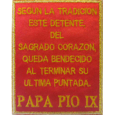En la parte trasera lleva el siguiente texto: "Este Detente del Sagrado Corazón de Jesús queda bendecido al terminar su última puntada. Papa Pio IX".