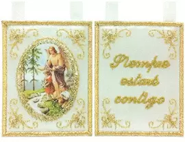 ESCAPULARIO BORDADO A MÁQUINA SOBRE TEJIDO DE RASO, CON HILOS METÁLICOS DORADOS Y ÓVALO IMPRESO DEL ÁNGEL DE LA GUARDA Y TEXTO "SIEMPRE ESTARÉ CONTIGO".