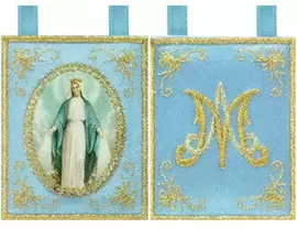 ESCAPULARIO BORDADO A MÁQUINA SOBRE TEJIDO DE RASO, CON HILOS METÁLICOS DORADOS Y ÓVALO IMPRESO DE LA MILAGROSA Y "M" MARIANA.
