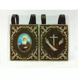 ESCAPULARIO BORDADO A MÁQUINA SOBRE TEJIDO DE RASO, CON HILOS METÁLICOS DORADOS Y ÓVALO IMPRESO DE FRAY LEOPOLDO Y SIMBOLOGÍA FRANCISCANA.