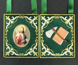 ESCAPULARIO BORDADO A MÁQUINA SOBRE TEJIDO DE RASO, CON HILOS METÁLICOS DORADOS Y ÓVALO IMPRESO DE SAN JUDAS TADEO Y SIMBOLOGÍA DE LA ADVOCACIÓN.