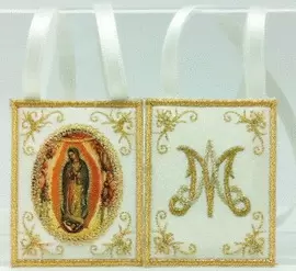 ESCAPULARIO BORDADO A MÁQUINA SOBRE TEJIDO DE RASO, CON HILOS METÁLICOS DORADOS Y ÓVALO IMPRESO DE LA VIRGEN DE GUADALUPE Y "M" MARIANA.