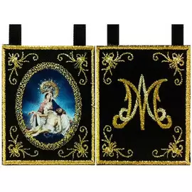 ESCAPULARIO BORDADO A MÁQUINA SOBRE TEJIDO DE RASO, CON HILOS METÁLICOS DORADOS Y ÓVALO GENÉRICO DE LA VIRGEN DE LAS ANGUSTIAS Y "M" MARIANA.