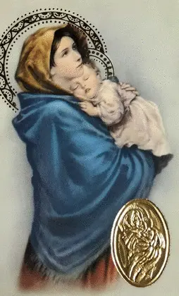 Estampa plastificada con medalla y oración de la Virgen Madorninna de Ferruzzi.
