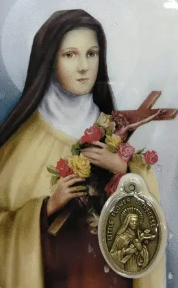 Estampa plastificada con oración y medalla de Santa Teresita de Lisieux.