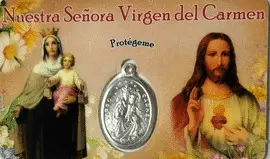 ESTAMPA-MEDALLA VIRGEN CARMEN Y CORAZÓN JESÚS. ORACIÓN. PLASTIFICADA
