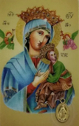 Estampa plastificada con oración de la Virgen del Perpetuo Socorro. Contiene una medalla de la Virgen de la Milagrosa.