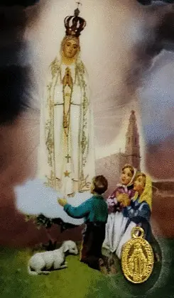 Estampa plastificada y con oración de la Virgen de Fátima. Contiene una medalla de la Milagrosa.