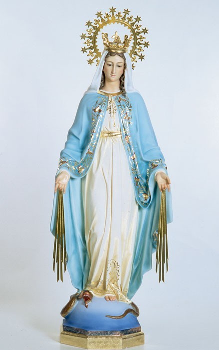Imagen en pasta de madera de la Virgen Milagrosa. Fabricada y pintada a mano. Clase primera.