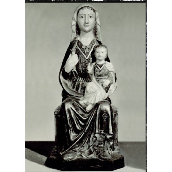 Imagen de Virgen Románica realizada en pasta cartón madera, con ojos de cristal y decorada a mano con pinturas al óleo.