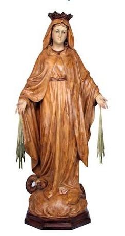 Imagen de la Virgen Milagrosa en pasta de madera. Fabricada y pintada a mano. Clase imitación madera.