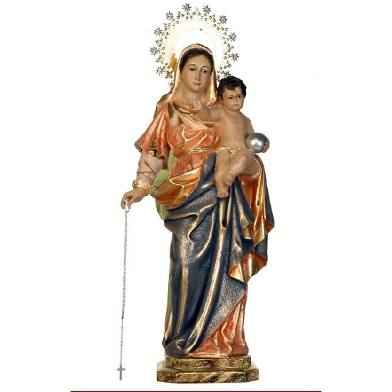 Imagen de la Virgen del Rosario realizada en pasta cartón madera, con ojos de cristal y decorada a mano con pinturas al óleo.