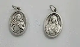 Medalla de metal de dos caras: Corazón de Jesús y Corazón de María.
