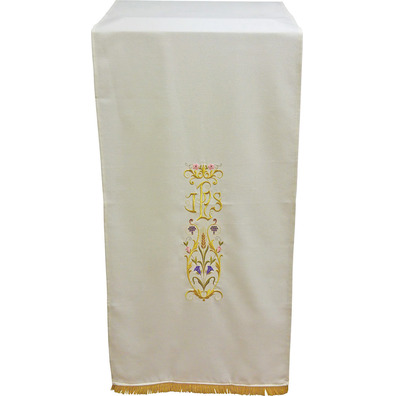 Precioso paño de atril bordado.Disponible en los seis colores litúrgicos.100% poliester.50 cm de ancho y 2,50 metros de largo.INDICAR EN OBSERVACIONES EL COLOR/ES DESEADOS.A JUEGO CON LA CASULLA 87582 ...