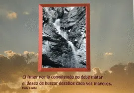 Postal de Paisaje con frase de Paulho Coelho: ''El Amor por lo conquistado no debe matar el deseo de buscar desafios cada vez mayores''.