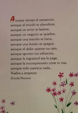 Aunque sientas el cansancio, aunque el triunfo te abandone, aunque un error te lastime, aunque un negocio se quiebre, aunque una traición te hiera, aunque una ilusión se apague, aunque el dolor queme tus ojos, aunque ignoren tus esfuerzos, aunque la ingratitud sea la paga, aunque la incomprensión corte tu risa, aunque todo parezca nada... Vuelve a empezar.