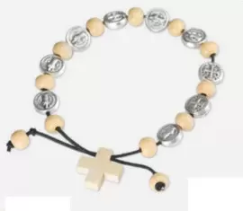 Pulsera brazalete decenario en madera y medallas de San Benito. Color marrón claro y oscuro.