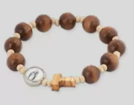 Pulsera brazalete de madera. Con cruz Tau y Cristo de la misericordia en la medalla.