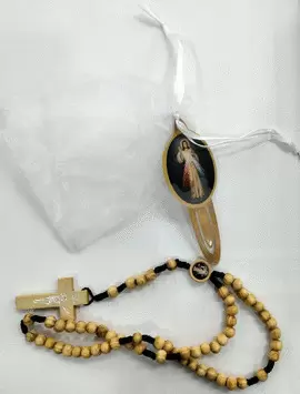 Bolsita de tela con marcapáginas y rosario del Cristo de la Misericordia en madera.