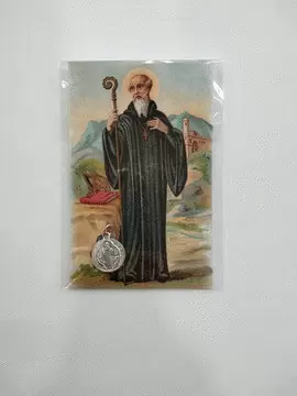 Sobre que contiene una estampa con oración y una medalla metálica de 1.7 cm de San Benito.