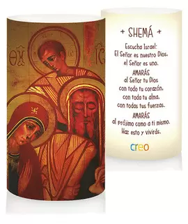 Una preciosa vela de cera real con bombilla LED decorada con La Sagrada Familia y la oración del Shemá Israel.