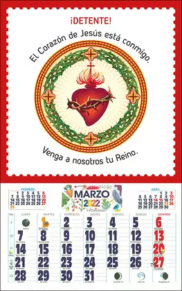 Sencillo calendario con imán, para colgar en superficies metálicas, con una imagen única el ¡Detente! del Sagrado Corazón y un faldón con una página arrancable para cada mes del año.