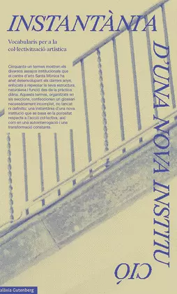Cinquanta-un termes mostren els diversos assajos institucionals que el centre d'arts Santa Mònica ha anat desenvolupant els darrers anys, enfocats a repensar la seva estructura, naturalesa i funció des de la práctica diària. Aquests termes, organitzats en sis seccions, confeccionen un glossari necessàriament incomplet, no tancat ni definitiu: una instantània d'una nova institució que es basa en la porositat respecte a l'acció col·lectiva, així com en una autointerrogació i una transformació constants