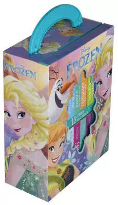 12 Libros de cartón incluidos en una bonita librería con su asa que podrás llevar contigo a todas partes. Cada uno de estos libros cuenta una divertida historia sobre FROZEN y sus amigos.