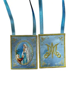 ESCAPULARIO BORDADO A MÁQUINA SOBRE TEJIDO DE RASO, CON HILOS METÁLICOS DORADOS Y ÓVALO IMPRESO DE LA VIRGEN DE LOURDES Y "M" MARIANA.