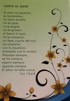 El amor es paciente, es bondadoso, no tiene envidia, no se jacta, ni se engríe, no es grosero ni busca lo suyo, no se exaspera, no lleva cuenta del mal, no simpatiza con la injusticia, simpatiza con la verdad. Disculpa siempre, se fía siempre , espera siempre, aguanta siempre. El amor no falla nunca.