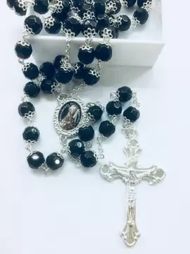 Precioso rosario cristal roca filigrana negro ("azabache")