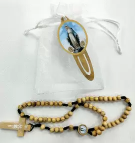 Bolsita de tela con marcapáginas y rosario de la Milagrosa en madera.