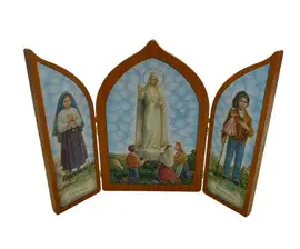 TRÍPTICO VIRGEN DE FÁTIMA. POLÍMERO EFECTO MADERA. 23X17 CM